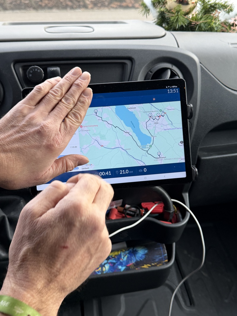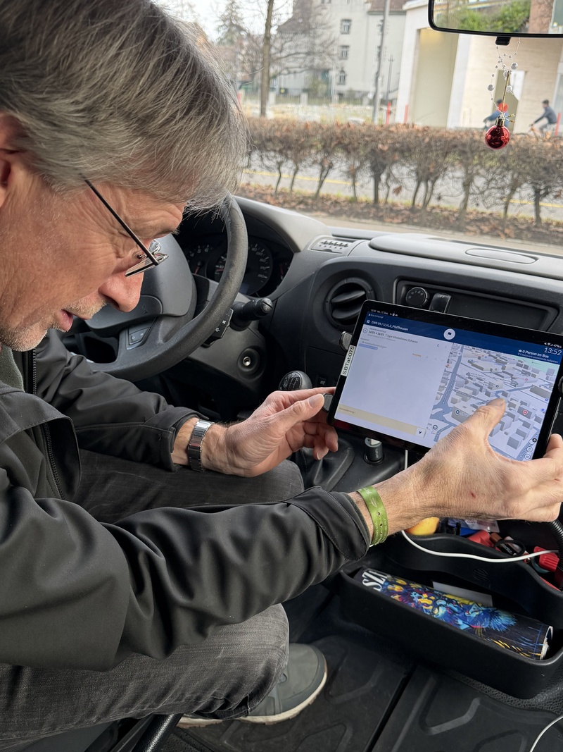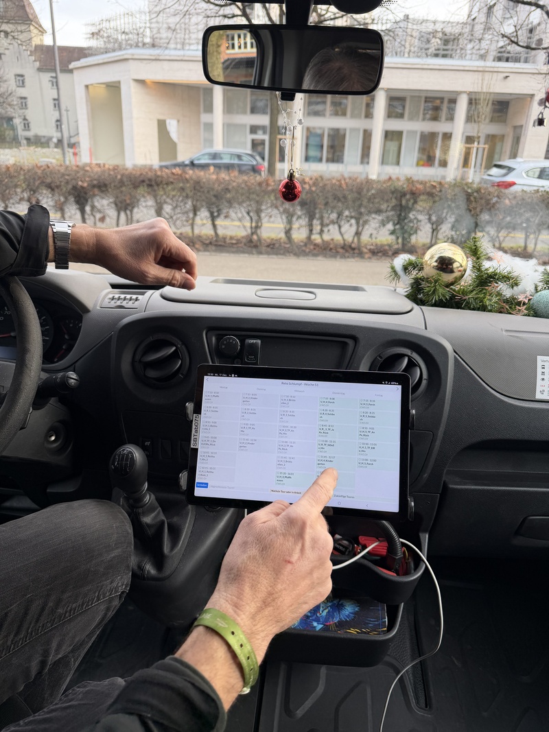 Das Tablet ist mein wichtigstes Arbeitsinstrument. Darauf sehe ich alle Touren, Haltestellen und Zeiten, die ich einhalten muss. Ich erkenne auch, ob ein Kind abgemeldet ist. Ohne Tablet und Handy darf ich nicht losfahren. Einmal habe ich das Tablet zu Hause vergessen, dann musste das Büro für mich jedes Kind «abhaken». Seither kontrolliere ich sehr bewusst: Tablet geladen, Ladekabel dabei – erst dann starte ich. Ich fahre Kinder der HPS und Regelschulkinder. HPS-Kinder holen wir «Hand zu Hand» ab: Eltern oder Erziehungsberechtigte übergeben mir das Kind persönlich. Sobald ich es im System einlogge, sehen sie in der App: «Das Kind ist im Bus». Sie können sogar live sehen, wo der Bus ist. Das ist ideal bei Verspätungen.